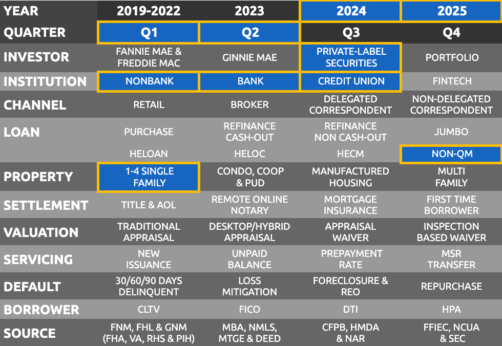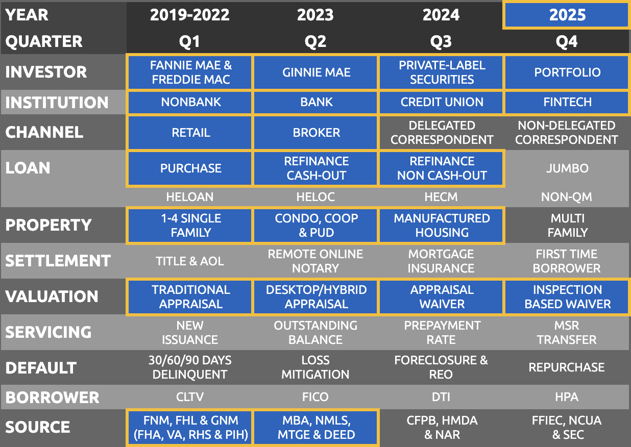 Top Originators Property Valuations Market Share Report for Full Year of 2025, showing Loan Count and Market Share (%) by Individual Lender, Loan Type (Conventional, Government & Home Equity) and Property Valuation. Allows users to identify lenders directly originating loans for the most recent quarter, and the property valuations being used. Excludes Correspondent/Purchased loans.